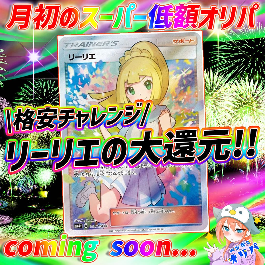 がんばリーリエ、ムンクピカチュウ、リザードンEX、カイリューMUR、メガリザードンSAR、ゲンガー&ミミッキュGX SA、ギラティナV SA、メガリザードンMUR、メガゲンガーex SAR、グレイシアVmax SA、マリィSR、メガカイリューSAR、イーブイGX SA、ピカチュウex SAR、ブラッキーex SAR、ソルガレオ&ルナアーラGX SA、レシラムBWR、メガルカリオex SAR、オドリドリex SAR、ニャースプロモ、ブラッキーマスターボールミラー、シャワーズV SA、Nのゾロアークex SAR、マリィのオーロンゲex SAR、リザードンVstarなど×3000